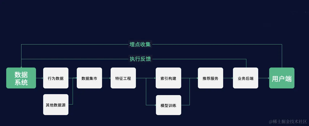对于算法实现的“千人千面”来说,它的流程一般从数据系统开始,采集用户行为数据并灌输至算法推荐系统,经过一系列的处理,推荐最合适的结果,然后再将结果返回用户前端做展示,同时监测用户点击效果,以此判断本次推荐效果的质量,持续优化,形成算法推荐的完整闭环。如下图所示: 在以上闭环中,模型训练对于业务人员来讲是一个黑盒,它主要分为三个步骤: