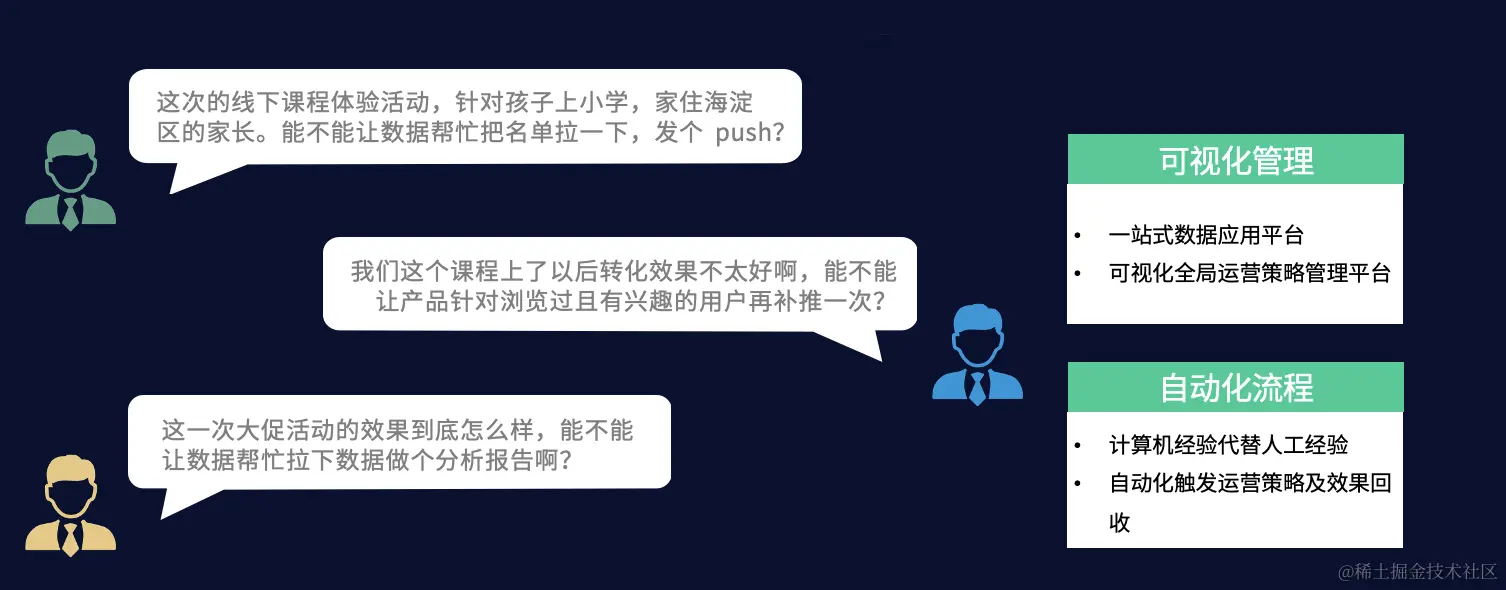在人工与机器智能落地方面,它的本质很好理解。首先,我们会基于特定的条件去挑选出满足条件的用户,往上可以跟一些通道系统、营销系统做对接,名单就会被自动推送,我们接下来要做的是发短信、推 push、发优惠券、发红包等一系列动作,这个是针对我们圈选的人群做的一些针对性运营设计;往下走可以对接内容营销,配置展示的内容以及顺序,通过人工决策指明方向,然后再由机器自动化去实现。