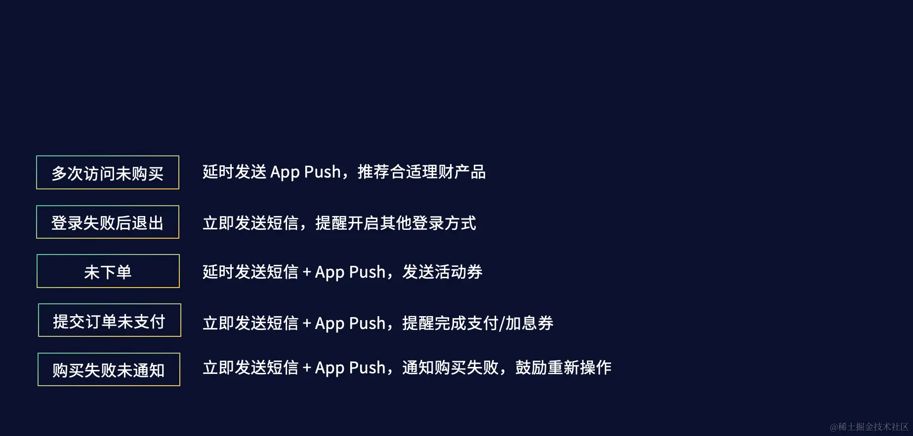 比如用户访问理财详情页但并没有在指定的时间内完成转化,或者因为某些原因造成登录失败进而导致用户流失……梳理完用户行为流程之后,针对各个环节的流失风险针对性制定策略。针对访问未购买的用户,推送 push 为其推荐更加合适的理财产品;针对提交订单未支付的用户,站内 push 配合短信触达,发送优惠券等促成用户转化。 **线,流程推进。**面向特定功能、特定业务、特定活动去做的持续性推广,设计一些流程性的任务,比如在进行优惠券推送时,如果 5 元优惠券带来的转化效果并不好,那么改为推送 10 元的优惠券,根据效果层层递进,试探性地触达,所以该方法适合针对特定用户达成的目标需要做持续运营的场景。