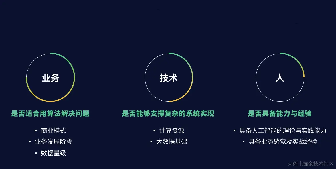 通过以上,我们可以了解到算法本质上要结合业务去实现,且有一定的门槛,具体表现在业务、技术和人三方面:
