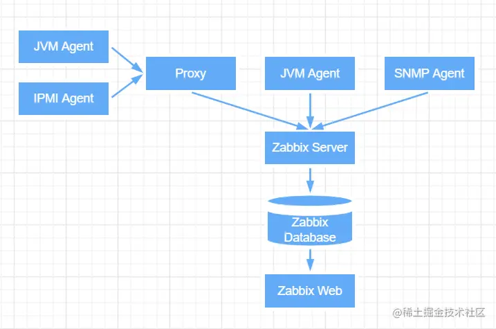 Zabbix核心组件主要是Agent和Server,其中Agent主要负责采集数据并通过主动或者被动的方式采集数据发送到Server/Proxy,除此之外,为了扩展监控项,Agent还支持执行自定义脚本。Server主要负责接收Agent发送的监控信息,并进行汇总存储,触发告警等。