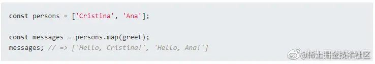 persons.map(greet) 获取 persons 数组的所有元素,并分别用每个元素作为调用参数来调用 greet() 函数: `greet('Cristina'), greet('Ana')。
