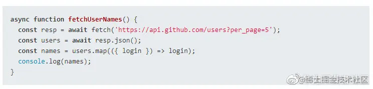 fetchUserNames() 是异步的,因为它以 async 为前缀。函数 await fetch('https://api.github.com/users?per_page=5') 从 GitHub 上获取前5个用户 。然后从响应对象中提取 JSON 数据:await resp.json()。