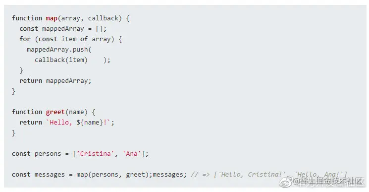 有意思的是 persons.map(greet) 方法可以接受 greet() 函数作为参数。这样 greet() 就成了回调函数。