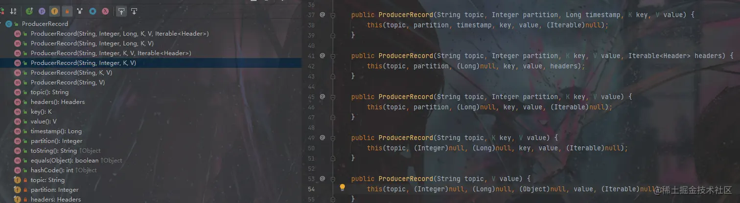 其中的topic、header从生产者的配置文件获取,而key则由ProducerRecord(被发送的消息)的构造函数传入。下图是ProducerRecord的构造函数