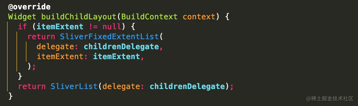 BoxScrollView的buildSlivers方法中,调用了buildChildLayout方法,该方法又是一个抽象方法,需要由子类来实现。如下: