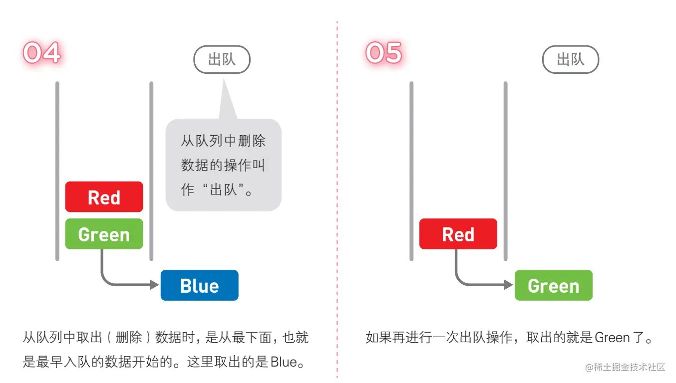 - dequeue 出队,队列最前面的数据移除;
