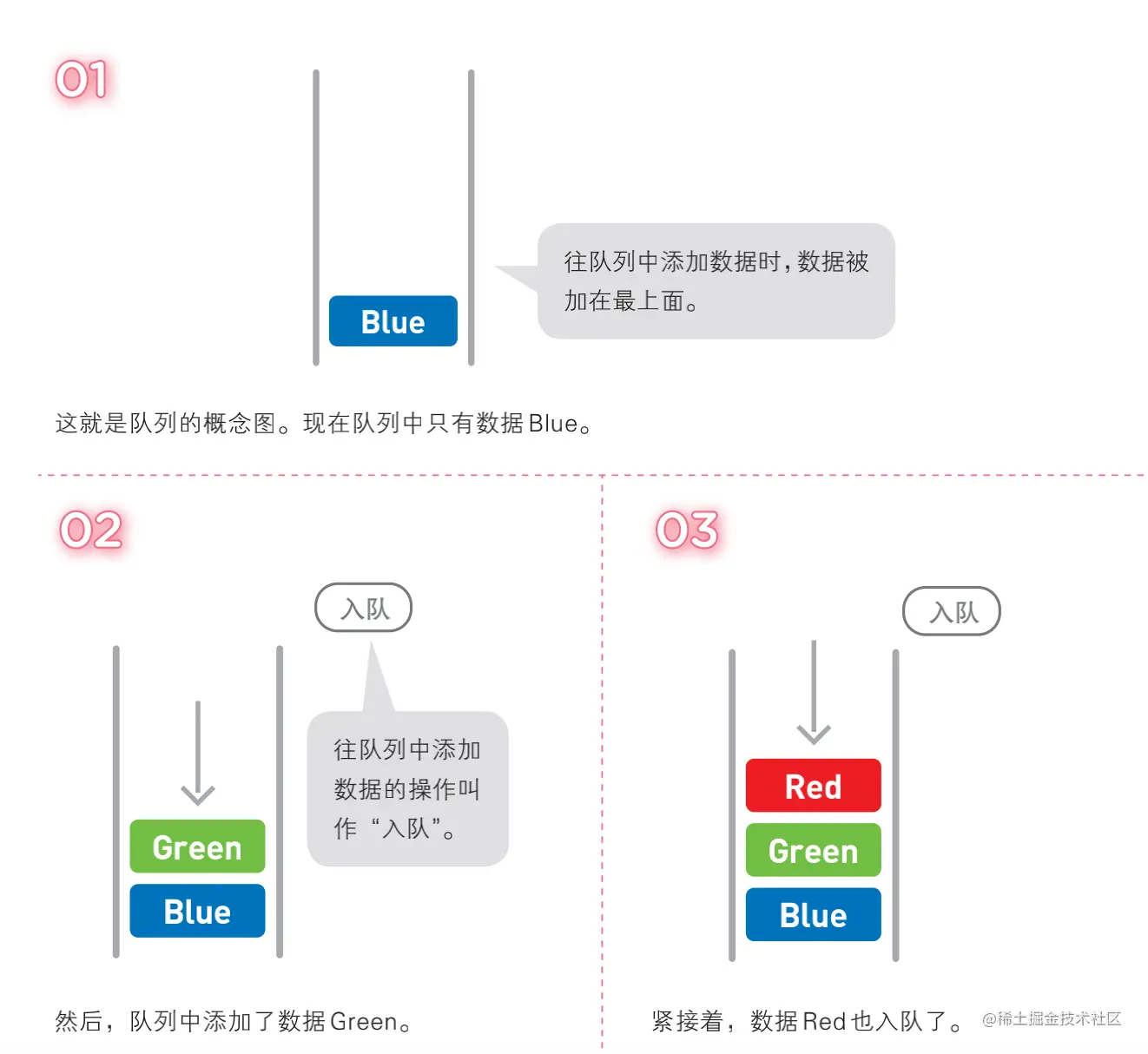 - enqueue 入队,添加到队列尾部;