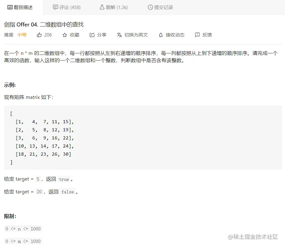 一开始只能想到暴力法。看了评论区还有另外一种方法,那就是从二维数组的最右上角或者最左边下角开始查找目标值,通过比较目标值和数组元素来控制行或列的变化来查找元素,最终得出结果。注意一下数组为空的特殊情况