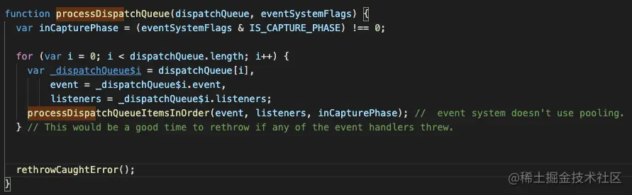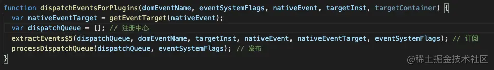 可以非常清晰的看到,这里用了发布订阅模式,通过extractEvent$5订阅消息,processDispatchQueue发布消息