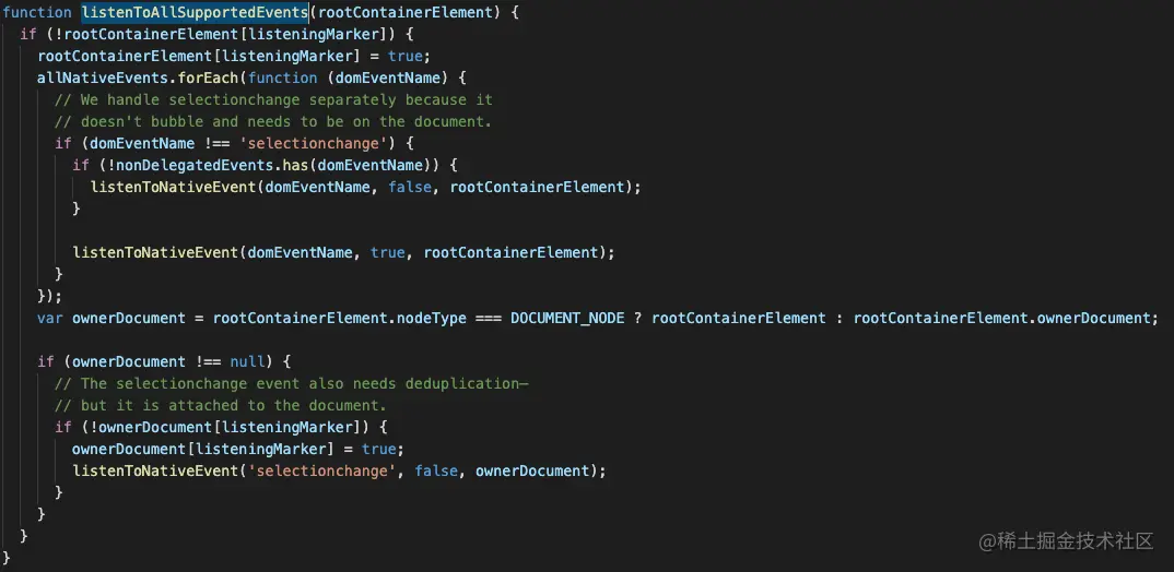 首先,reactDom在创建整个应用的根节点的时候会去调用listenToAllSupportedEvents这个方法