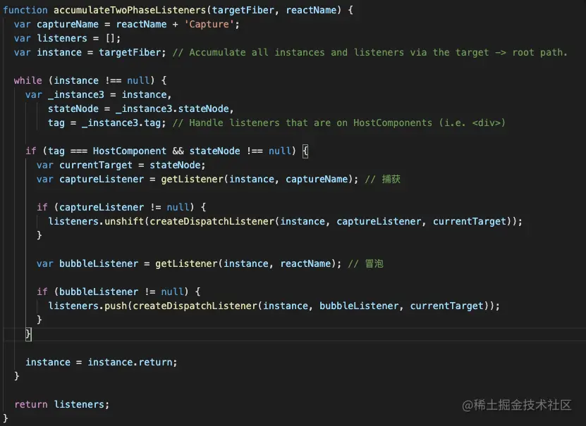 可以看到react会从此次事件循环中的target对应的fiber一直向上遍历,如果是capture(捕获)事件,则会向listeners前面插入监听函数(captureListener)。否则在listeners队尾插入监听函数(bubbkeListener)。这也就遵循了先捕获再冒泡的规则。