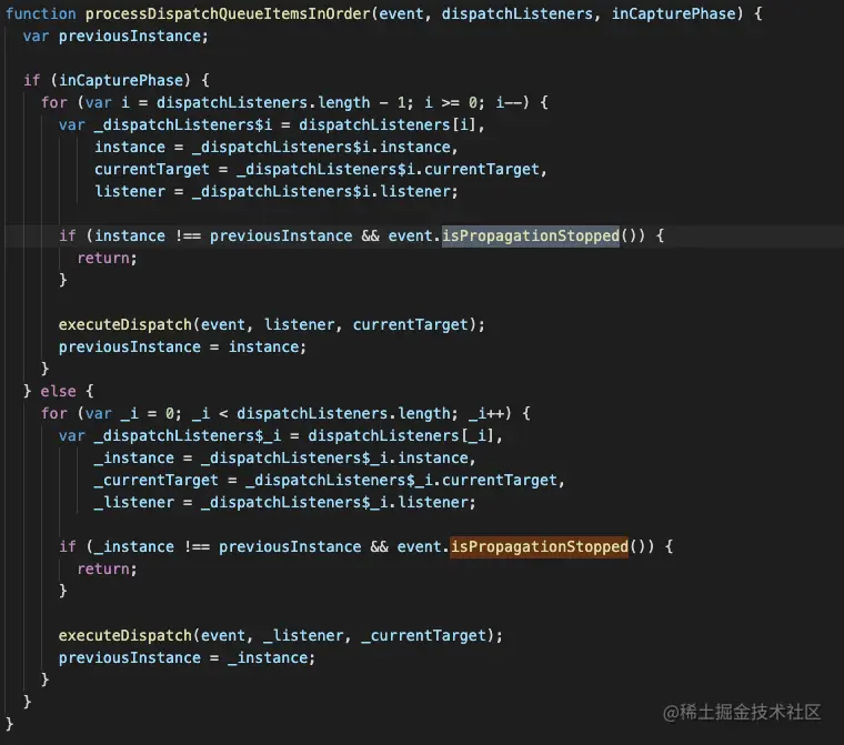 在发布阶段去循环执行dispatchQueue时会与一个判断条件,如果isPropagationStopped是true,则直接退出循环,也就达到了中断事件传播的效果。