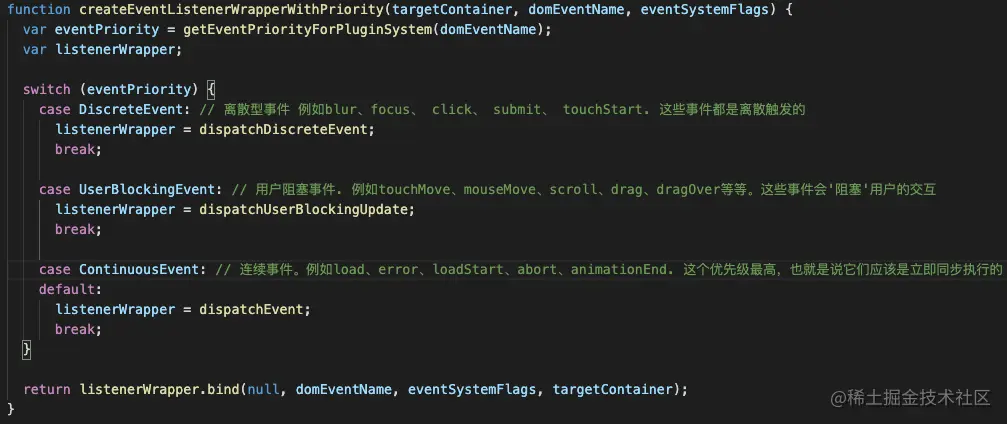listenToNativeEvent最终会addEventListener去注册相应的事件监听器。那么重点就在于注册监听器的回调函数listener是啥。代码中可以看到listener是由createEventListenerWrapperWithPriority方法返回的