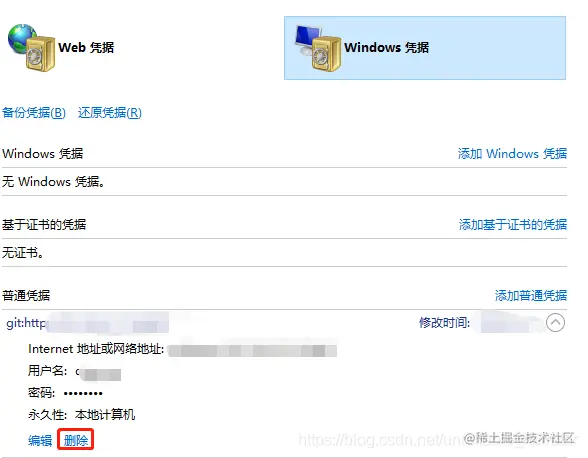 方式一:在控制面板里面将凭证删除.