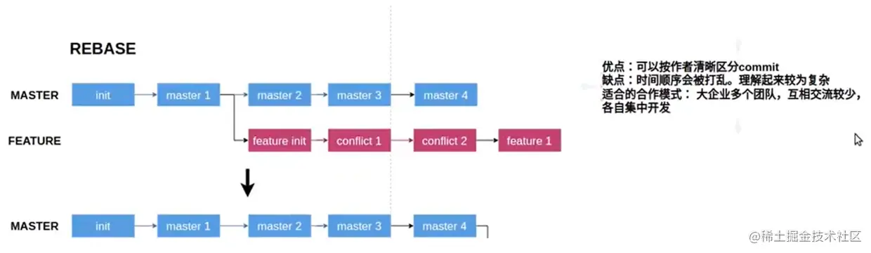 rebase会把你当前分支的 commit 放到公共分支的最后面,所以叫变基。就好像你从公共分支又重新拉出来这个分支一样。 举例:如果你从 master 拉了个feature分支出来,然后你提交了几个 commit,这个时候刚好有人把他开发的东西合并到 master 了, 这个时候 master 就比你拉分支的时候多了几个 commit,如果这个时候你 rebase master 的话,就会把你当前的几个 commit,放到那个人 commit 的后面。此时切换到master分支再用merge进行合并即可.