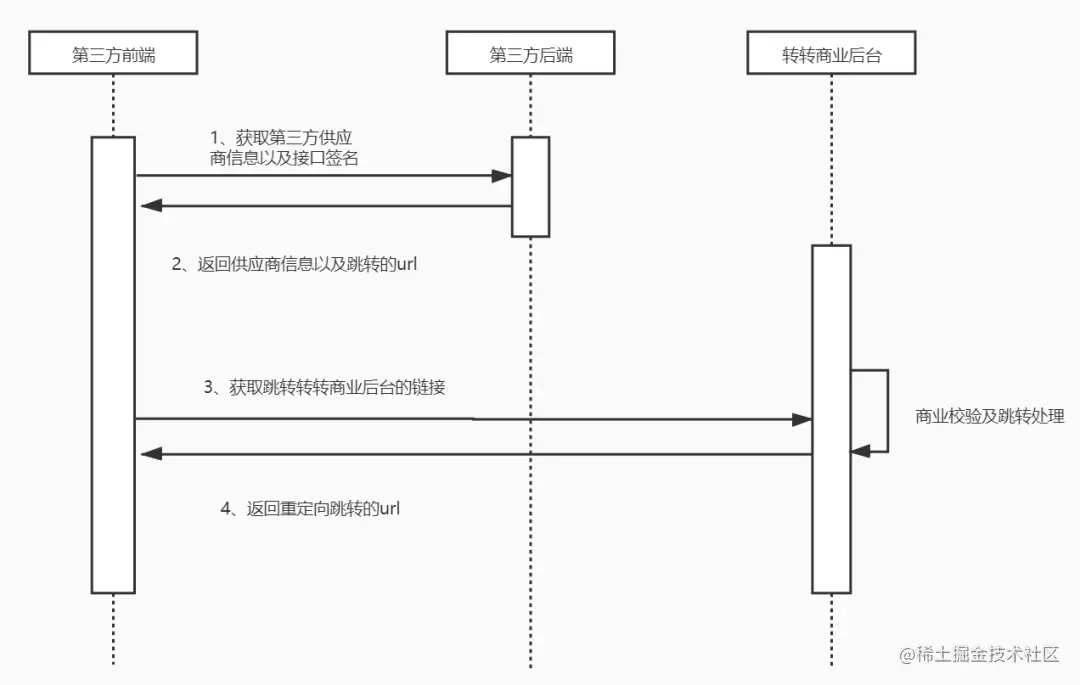 由此可知,第三方供应商侧只需要保证用户能够正确跳转到商业侧,以及所带的用户信息的正确性,后续流程则是有商业侧来保证。由交互图也能得知对方的工作量在整个项目中的占比,能大致评估出第三方可能带来的风险大小。
