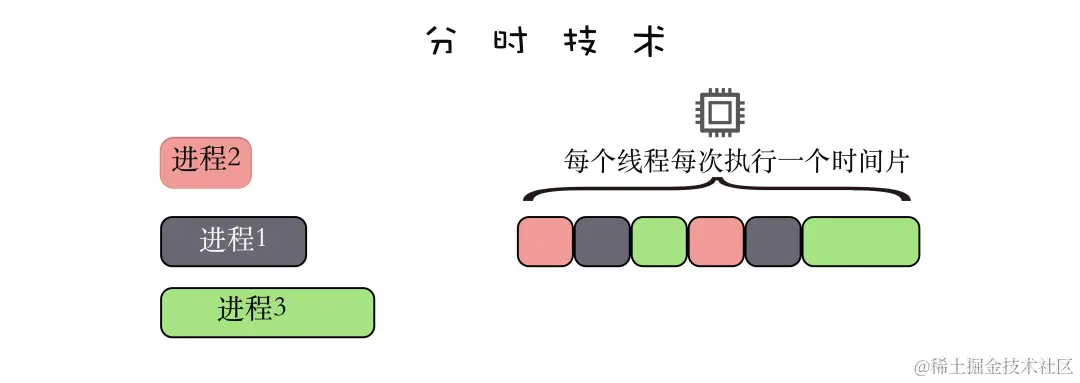 假设此时有三个进程,进程1只需要 2 个时间片,进程 2 需要 1 个时间片,进程 3 需要 3 个时间片。进程 1 执行到一半的时候,累了,不想执行了,休息会(挂起),进程 2 执行,进程 2 一梭子就执行完了,进程 3 等不及了马上执行,执行三分之一后,进程1开始执行,这样循环根据时间片的执行方式即分时技术