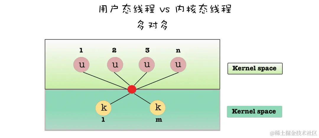 即 n 个用户态线程对应 m 个内核态线程。m 通常小于等于 n,m 通常设置为核数,这种多对多的关系减少了内核线程且完成了并发,Linux 即采用的这种模型