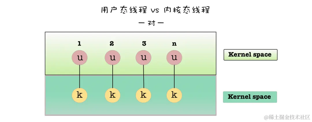 让每个用户态线程分配一个单独的内核态线程,每个用户态线程通过系统调用创建一个绑定的内核线程,这种模型能够并发执行,充分利用多核的优势,出名的 Windows NT 即采用这种模型,但是如果线程比较多,对内核的压力就太大