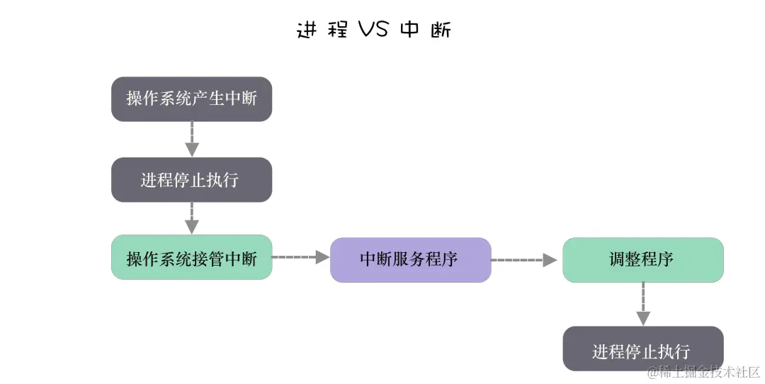 - 操作系统感知到有个进程需要切换,先发出一个中断信号给 CPU ,让其停止当前进程