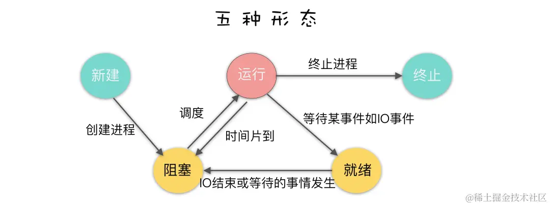 - 运行状态------>阻塞状态:运行状态的进程由于时间片用完,操作系统将进程更改为就绪状态