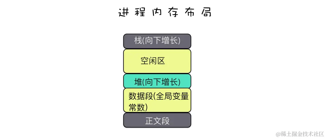 操作系统会告诉进程如何使用内存,大概分为哪些区域以及每个区域做什么。简单描述下下图各个段的作用。