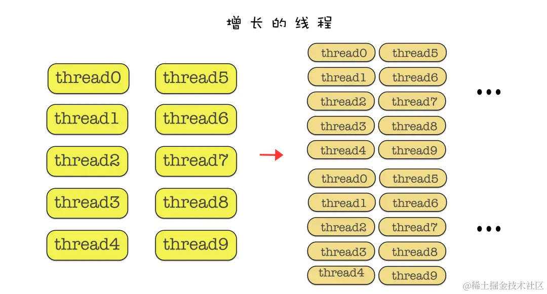此时的方案要么增加服务器要么提升代码效率。多个线程在进行作业的时候,难免会遇到某个线程等待 IO 的情况,此时会阻塞当前线程切换到其他线程,使得其他线程照常执行,线程少的时候没什么问题,当线程数量变多就会出现问题,线程数量的增加不仅占用非常多的内存空间且过多的线程的切换也会占用大量的系统时间