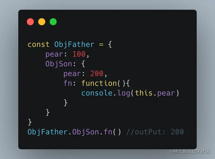 这段代码存在着一个嵌套关系父对象里面嵌套着子对象,那么在最终调用的时候,this会指向调用它的对象,看到这相信大家已经明白上下文调用里面的this逻辑了吧,那我们再来一道综合题巩固一下吧,大家先猜猜下面的输出是啥