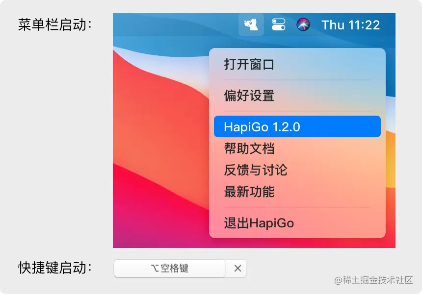 HapiGo 与常见应用不同,它没有常驻主窗口。应用打开之后,只会在屏幕右上角菜单栏出现一个狗狗图标,其他并无变化。此时,我们有 2 种方式启动 HapiGo: