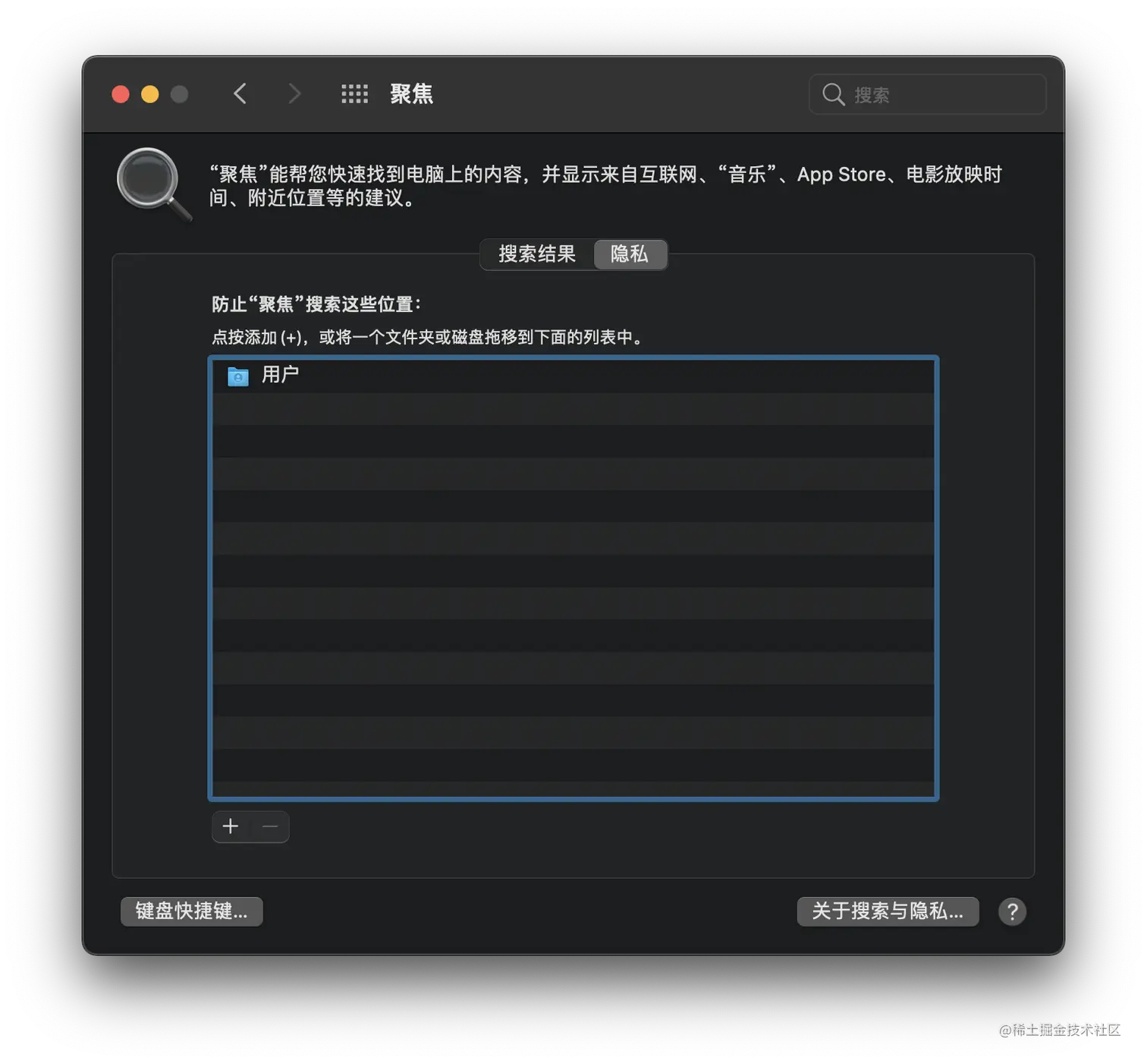 如果你在搜索时遇到明显的搜索异常,可以尝试通过重置 Spotlight 来解决。 打开系统偏好设置-聚焦(Spotlight)-隐私。在这里,点击左下角+号。将异常的文件夹或者整个磁盘添加到此处,然后再移除。这样操作之后,Spotlight 会花数分钟至数十分钟自动进行重新索引。