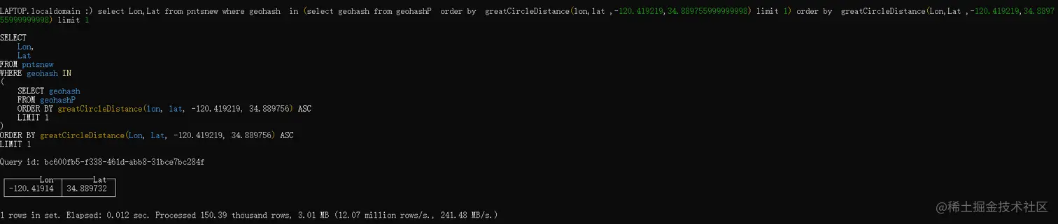 select Lon,Lat from pntsnew where geohash in (select geohash from geohashP order by greatCircleDistance(lon,lat ,-120.419219,34.889755999999998) limit 1) order by greatCircleDistance(Lon,Lat ,-120.419219,34.889755999999998) limit 1
