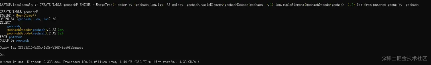 CREATE TABLE geohashP ENGINE = MergeTree() order by (geohash,lon,lat) AS select geohash,tupleElement(geohashDecode(geohash ),1) lon,tupleElement(geohashDecode(geohash ),2) lat from pntsnew group by geohash