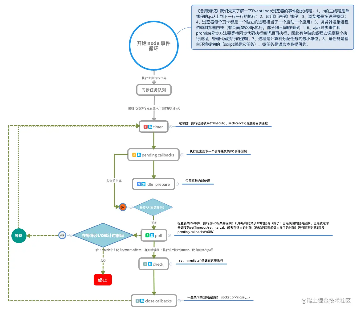 在每次运行的事件循环之间,node.js会检查自己是否在等待任何异步I/O或计时器,如果没有则完全关闭。图中的timer、poll 、pending callback、check......每一行都是一个队列。所以他的任务是被分配到不同的队列中的,当主栈代码执行完后会进入图中的执行队列中,依次扫描。