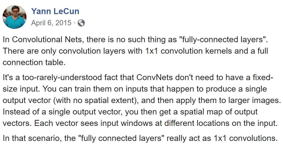 关于 卷积的一个有趣的观点来自 Yann LeCun, “在卷积神经网络中, 没有‘全连接层(fully-connected layers)’的概念。只有卷积层具有卷积核和全连接表。”