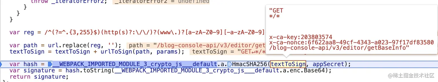 看起来很像是请求header中的一些数据拼接而成的字符串,试了几次后确定下来,这个字符串的第一、二行是固定的,再往下 x-ca-key:203803574 这行也是固定字符,再下一行其实就是上面计算出来的 x-ca-nonce及其值的 k-v字符串,这个时候再回头看 xCaSignature() 方法就很清晰了,好家伙,代码写了一大堆,就是为了拼接这个字符串