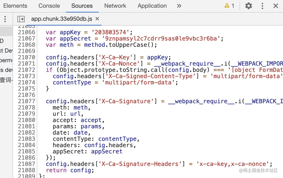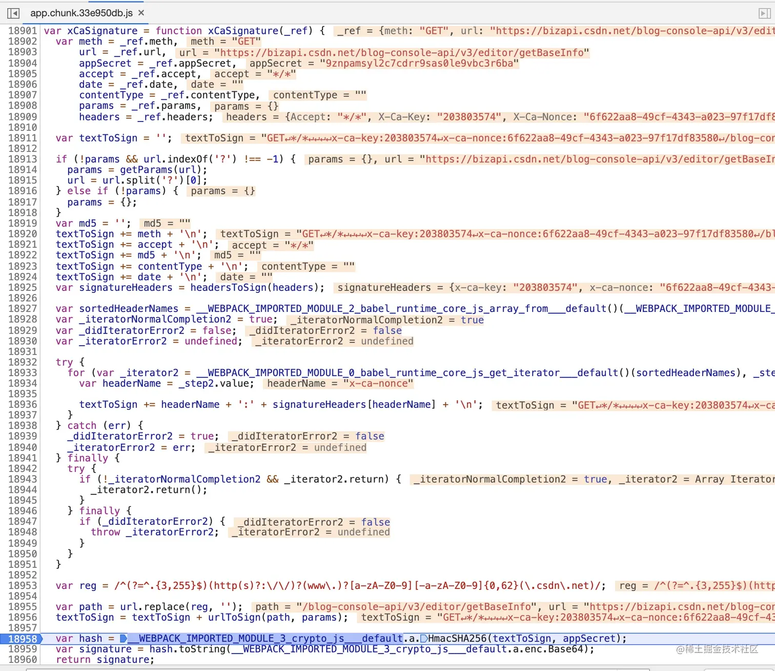 重复刷新编辑页面,发现对于完全相同的一个请求,每次请求的header头中,这四个属性中的 x-ca-key 和 x-ca-signature-headers都是固定的,x-ca-nonce 和 x-ca-signature 则会发生变化,于是想到这两个值可能是其他接口返回的,但是把页面相关的所有接口都看了一遍,发现并没有相关信息,既然不是后端返回的,那么就只能是前端生成的