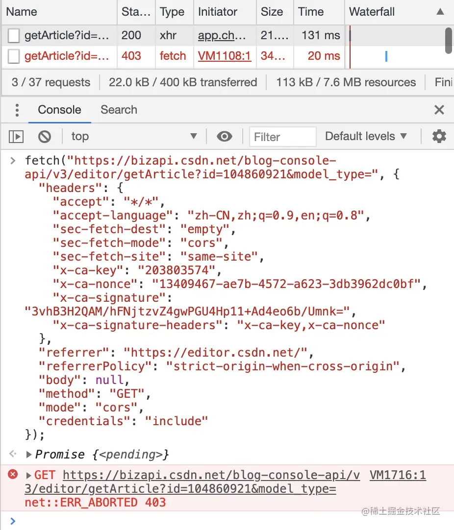 于是我去看了下 csdn的接口,接口是很好找的,就是 https://bizapi.csdn.net/blog-console-api/v3/editor/getArticle?id=xxx&model_type=,接着我就把这个链接复制下来继续写逻辑了,但是写完之后进行测试的时候,忽然发现接口 403 了