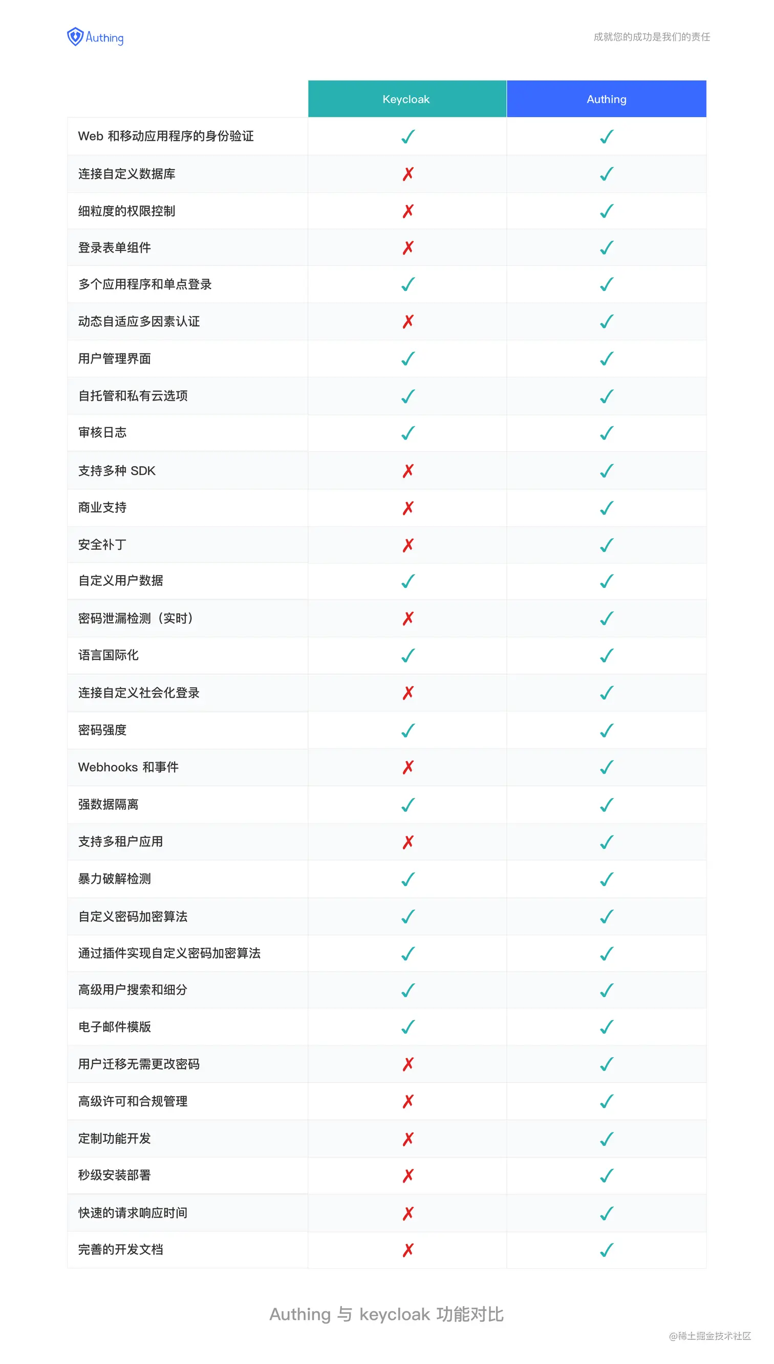 为了更好的了解 Keycloak 和 Authing,我们将二者的功能进行了详细的比较,得到了下图的功能对比表。