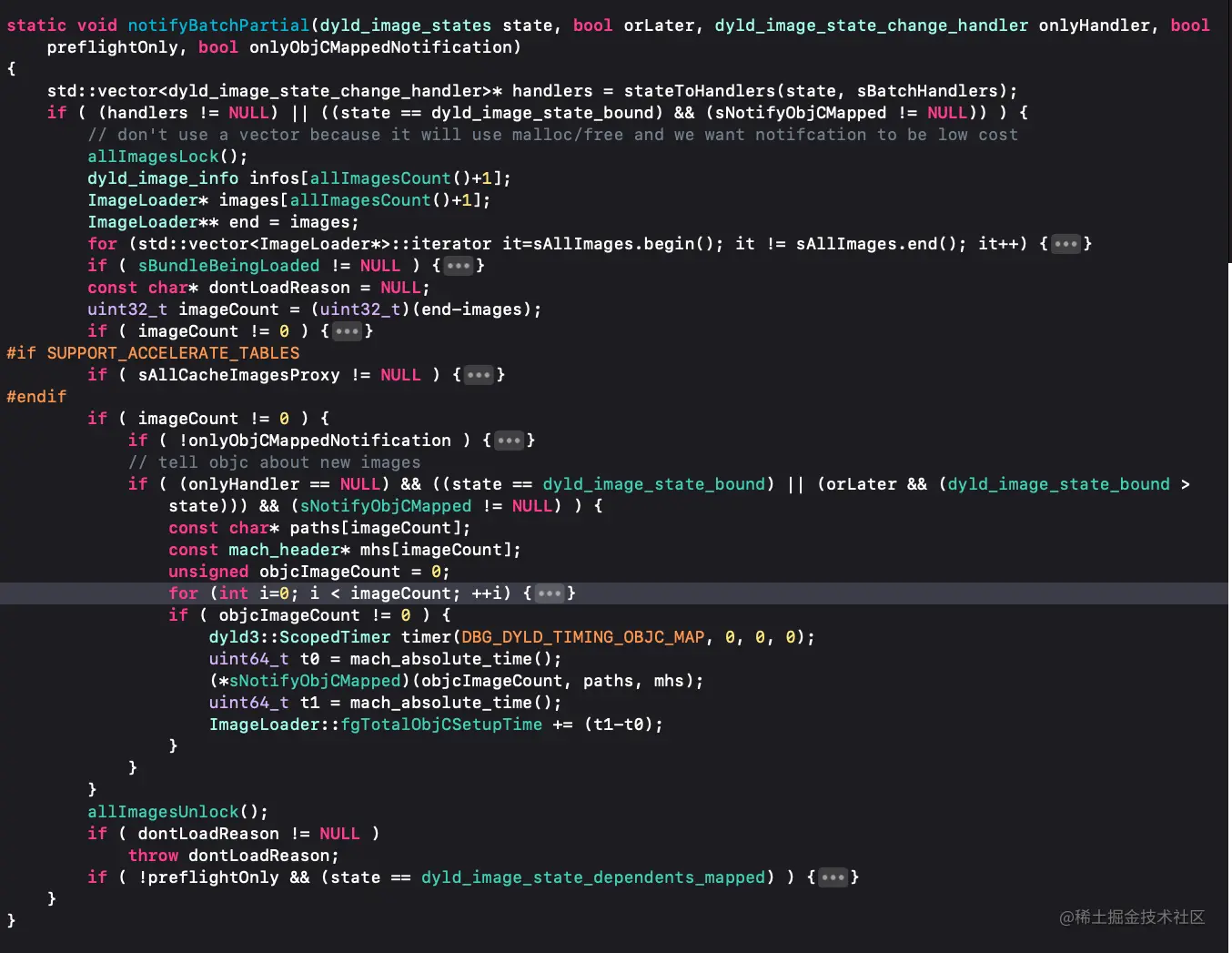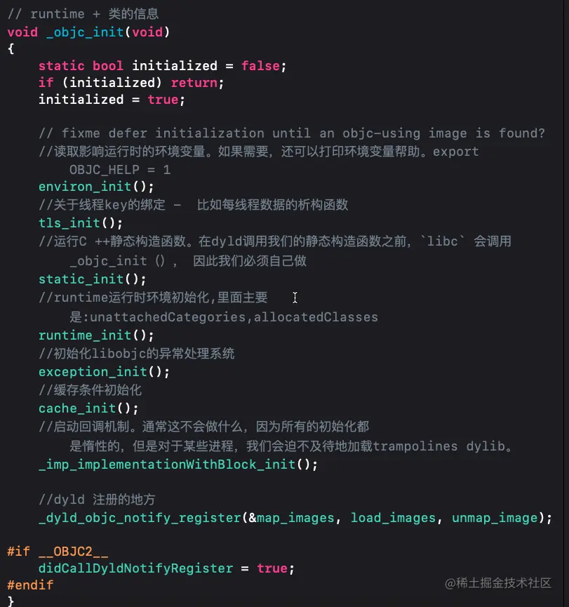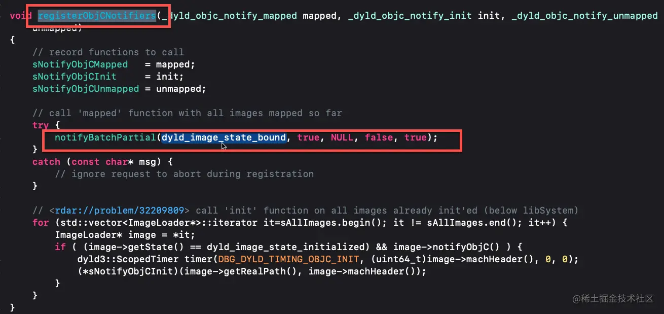 dyld注册,具体源码在dyld源码中void _dyld_objc_notify_register(_dyld_objc_notify_mapped mapped, _dyld_objc_notify_init init, _dyld_objc_notify_unmapped unmapped) { dyld::registerObjCNotifiers(mapped, init, unmapped); } //registerObjCNotifiers方法 void registerObjCNotifiers(_dyld_objc_notify_mapped mapped, _dyld_objc_notify_init init, _dyld_objc_notify_unmapped unmapped) { // record functions to call sNotifyObjCMapped = mapped; sNotifyObjCInit = init; sNotifyObjCUnmapped = unmapped; // call 'mapped' function with all images mapped so far try { notifyBatchPartial(dyld_image_state_bound, true, NULL, false, true); } catch (const char* msg) { // ignore request to abort during registration } // <rdar://problem/32209809> call 'init' function on all images already init'ed (below libSystem) for (std::vector<ImageLoader*>::iterator it=sAllImages.begin(); it != sAllImages.end(); it++) { ImageLoader* image = *it; if ( (image->getState() == dyld_image_state_initialized) && image->notifyObjC() ) { dyld3::ScopedTimer timer(DBG_DYLD_TIMING_OBJC_INIT, (uint64_t)image->machHeader(), 0, 0); (*sNotifyObjCInit)(image->getRealPath(), image->machHeader()); } } }
