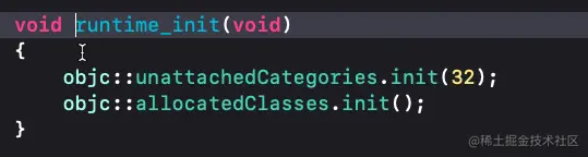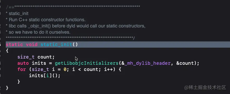 这里会运行 C++ 的静态构造函数,在 dyld 调用我们的静态构造函数之前,libc 会调用 _objc_init,所以这里我们必须自己来做,并且这里只会初始化系统内置的 C++ 静态构造函数,我们自己代码里面写的并不会在这里初始化。所以系统的c++函数会先于自定义的c++函数执行runtime_init