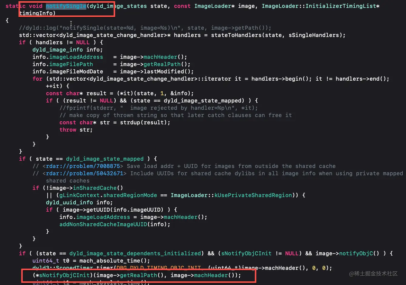 sNotifyObjCUnmapped = unmapped = unmap_imageload_images方法的出发时机 上文中分析dyld的加载流程juejin.cn/post/691870…的时候知道load_images方法调用在dyld中其实就是sNotifyObjCInit调用sNotifyObjCInit的调用又在notifySingle函数中执行notifySingle函数的调用是在dyld::main函数中初始化镜像文件的时候调用map_images方法的出发时机 上文分析中得知map_images函数的调用在dyld中对应的就是sNotifyObjCMapped的调用,所以在dyld源码中全局搜索sNotifyObjCMapped发现是在notifyBatchPartial函数中被调用然后再全局搜索