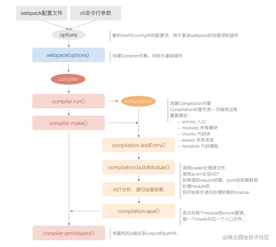 compilation 是 compiler 的一个hooks函数, compilation 会创建一次新的编译过程实例,一个 compilation 实例可以访问所有模块和它们的依赖,在获取到这些模块后,根据需要对其进行操作处理!