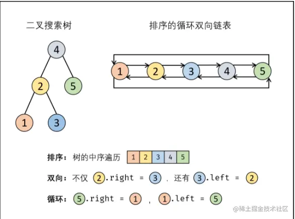 将二叉搜索树 转换成一个 “排序的循环双向链表” ,其中包含三个要素: