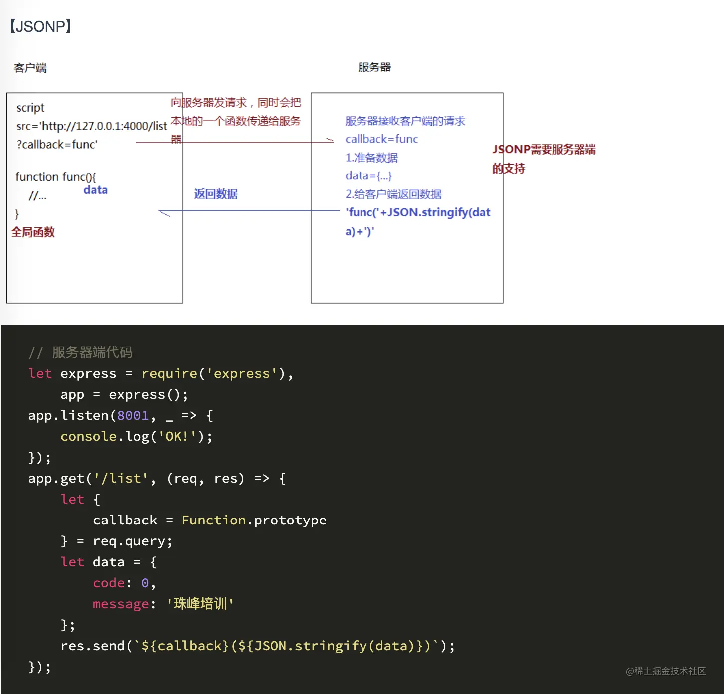 本质是利用了标签具有可跨域的特性;我们使用script标签请求地址,带上参数,参数值是我们在全局定义的一个函数;然后返回数据的时候,我们返回这个函数的调用,带上我们要传递回来的数据作为参数进行传递,这样浏览器会直接执行这个函数;这样就实现了跨域;