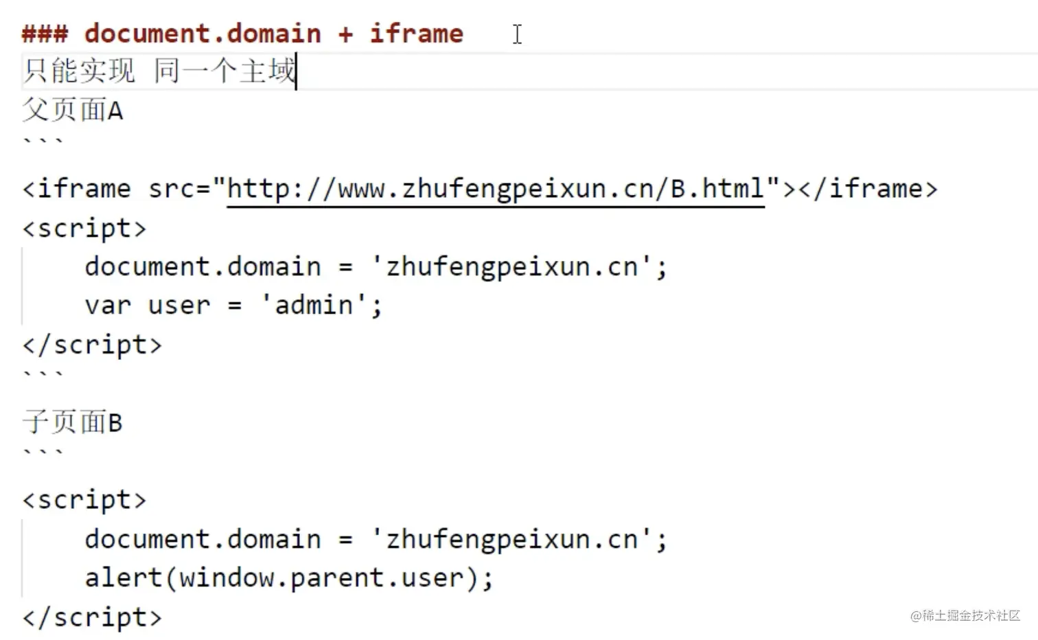 这种方式在A页面通过iframe引入B页面,然后A、B页面都设置document.domain = 主域名;