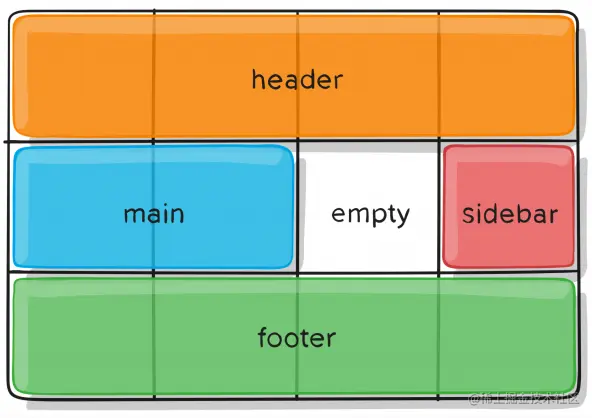 .item-a{ grid-area: header;}.item-b{ grid-area: main;}.item-c{ grid-area: sidebar;}.item{ grid-area: footer;}.container{ display: grid; grid-template-columns: 50px 50px 50px 50px; grid-template-rows: auto; grid-template-areas: "header header header header" "main mian . sidebar" "footer footer footer footer";}