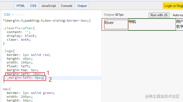 IE 6/7 存在双倍margin bug:在float元素左边加入一个外边距,会变成双倍边距。解决办法如2所示,IE 6/7会识别