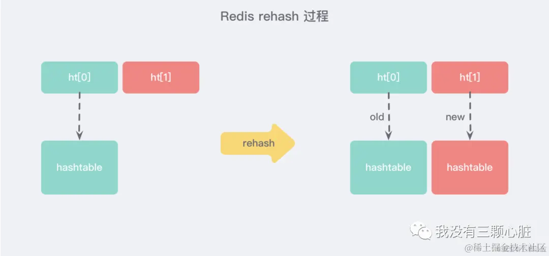 字典结构的内部持有了两个hashtable,未扩容时一个table为空,当需要扩容时,会将一个hashtable的值逐步搬到另一个hashtable的值。当搬迁完成时,新的hashtable会成为0号table,而旧的hashtable会成为1号,当下次rehash时,他就成了新的搬迁目标。