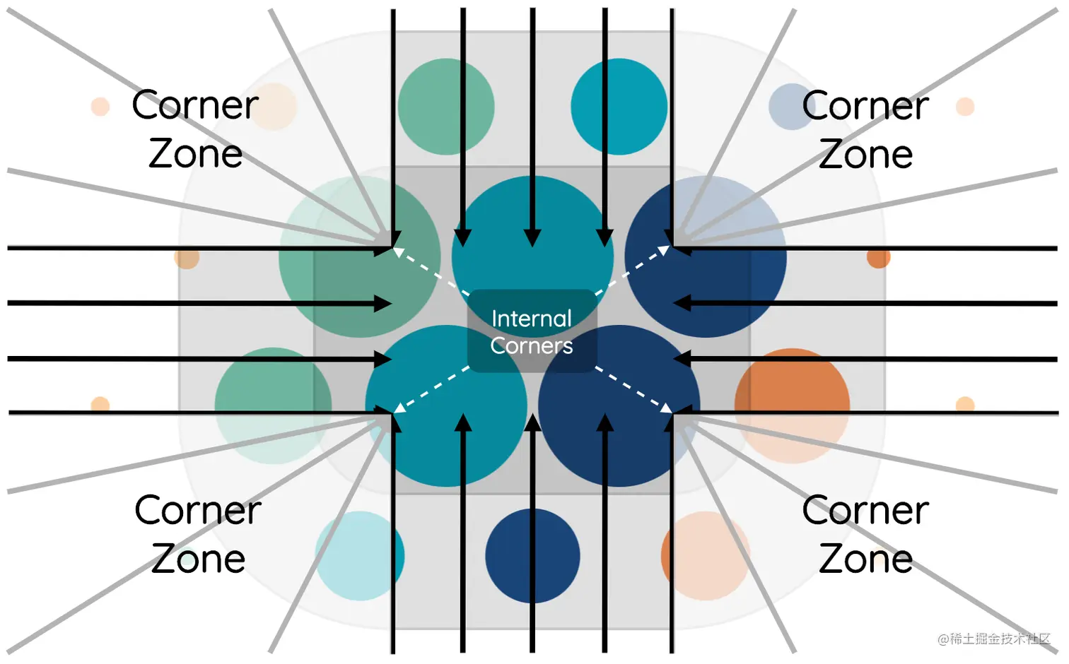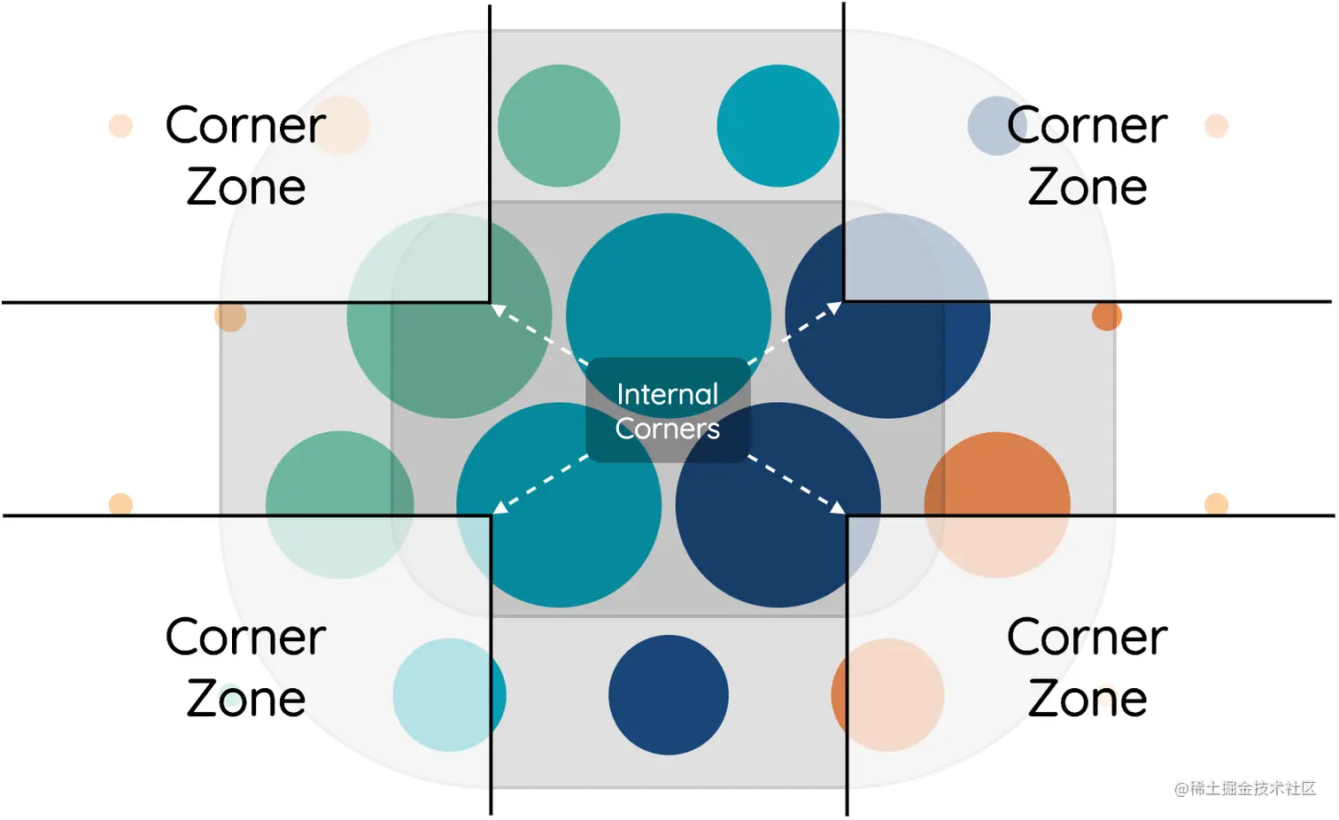 拐角区域定义为由画布的拐角以及中心区域的内部拐角(从边缘的嵌入的拐角半径)界定的四个区域。在拐角区域,尺寸相对于内部拐角沿径向(指沿半径的方向的)保持恒定。相比之下,拐角区域外部的气泡在 x 或 y 位置不变时保持大小不变。